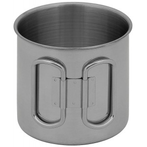2 alças dobráveis lateralmente Dimensões: ca. 9 x 9 cm (Di x A) Peso: ca. 120g Material: 100% Aço Inoxidável ca. 450 ml